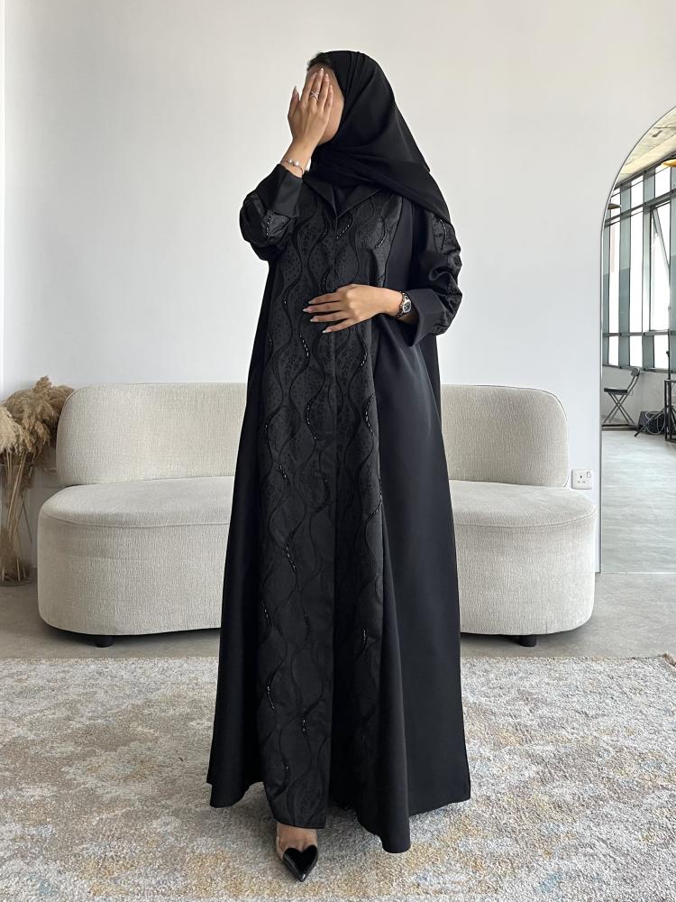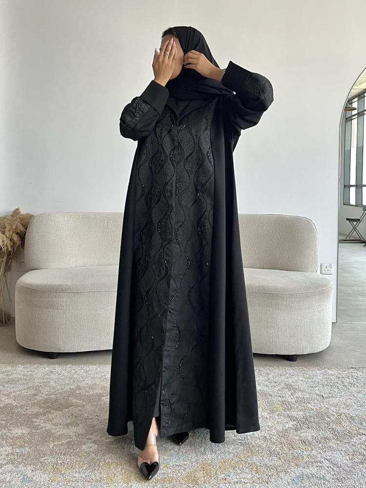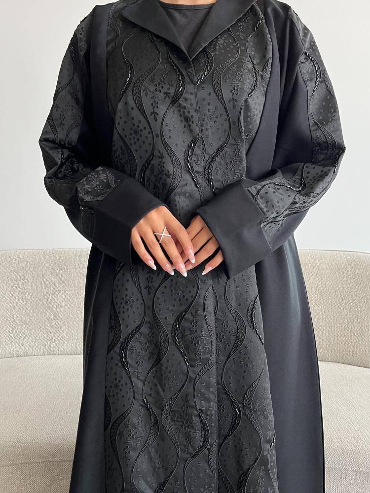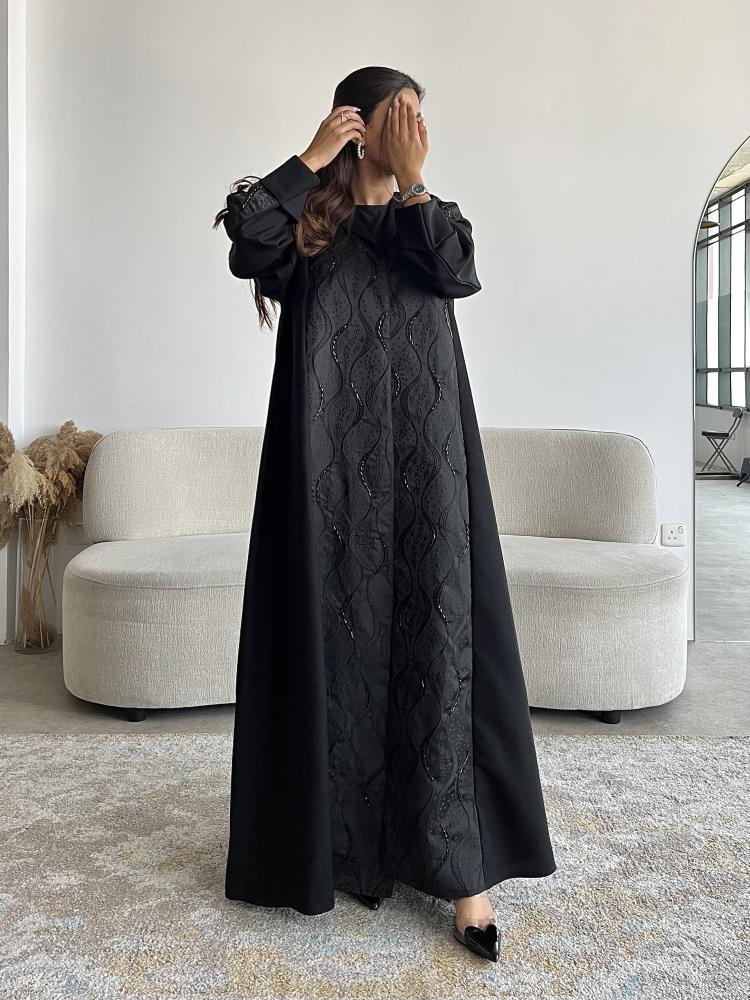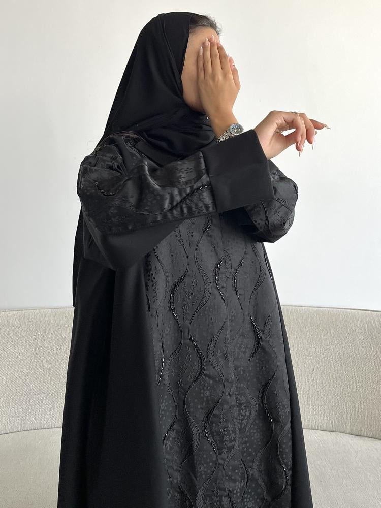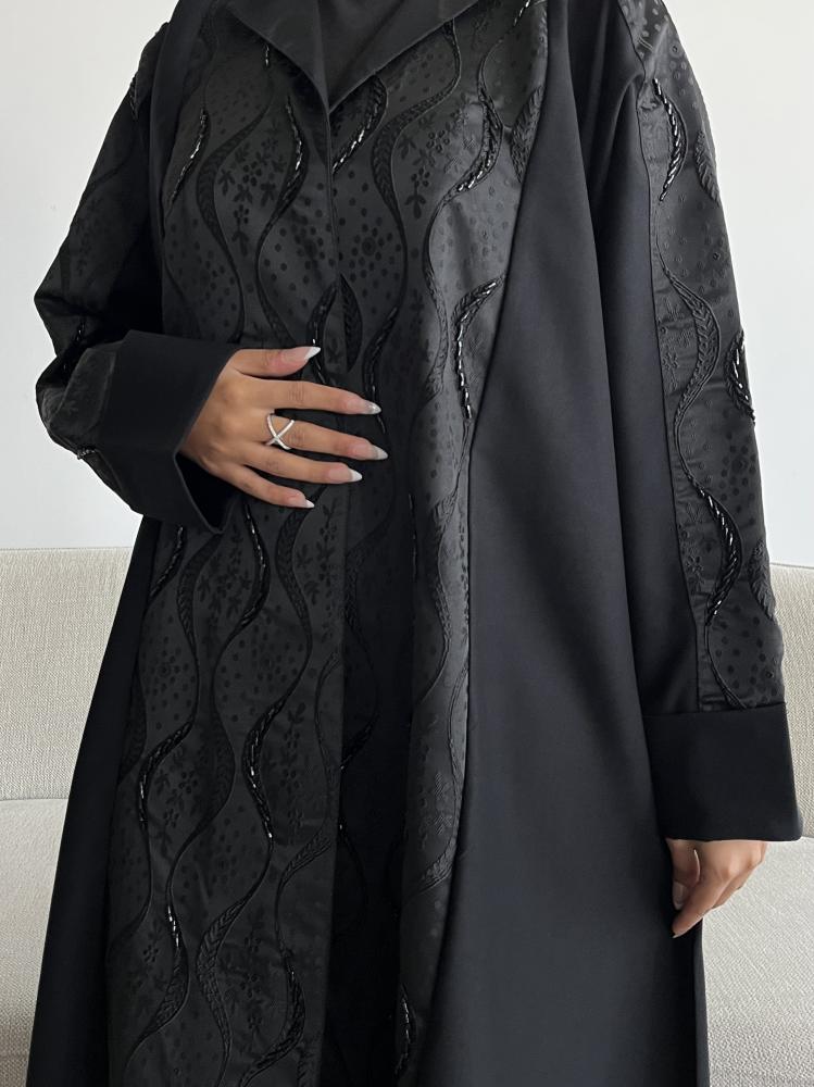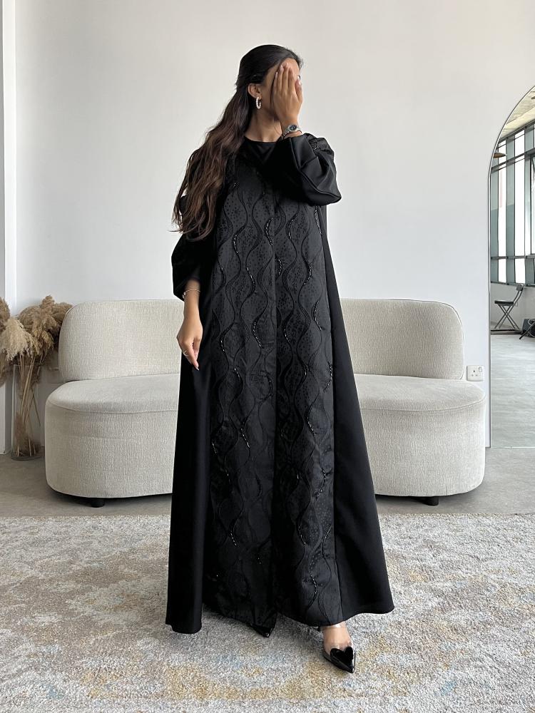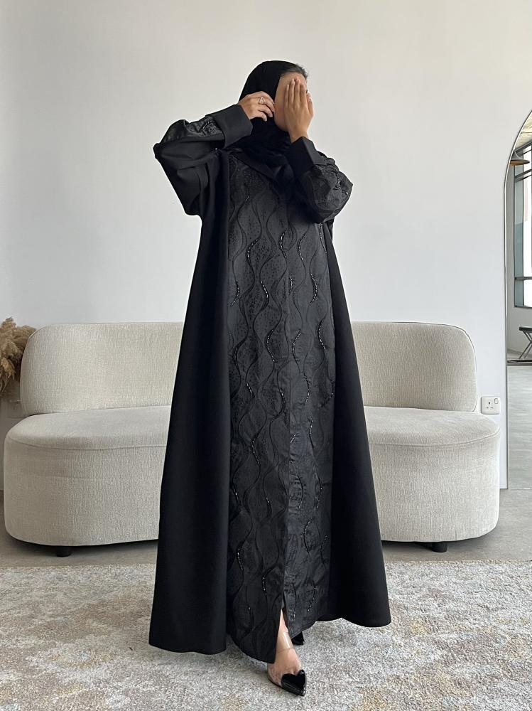 Z340 / قماش تفته واقف اسود مشجر من تحت وطرف الكم