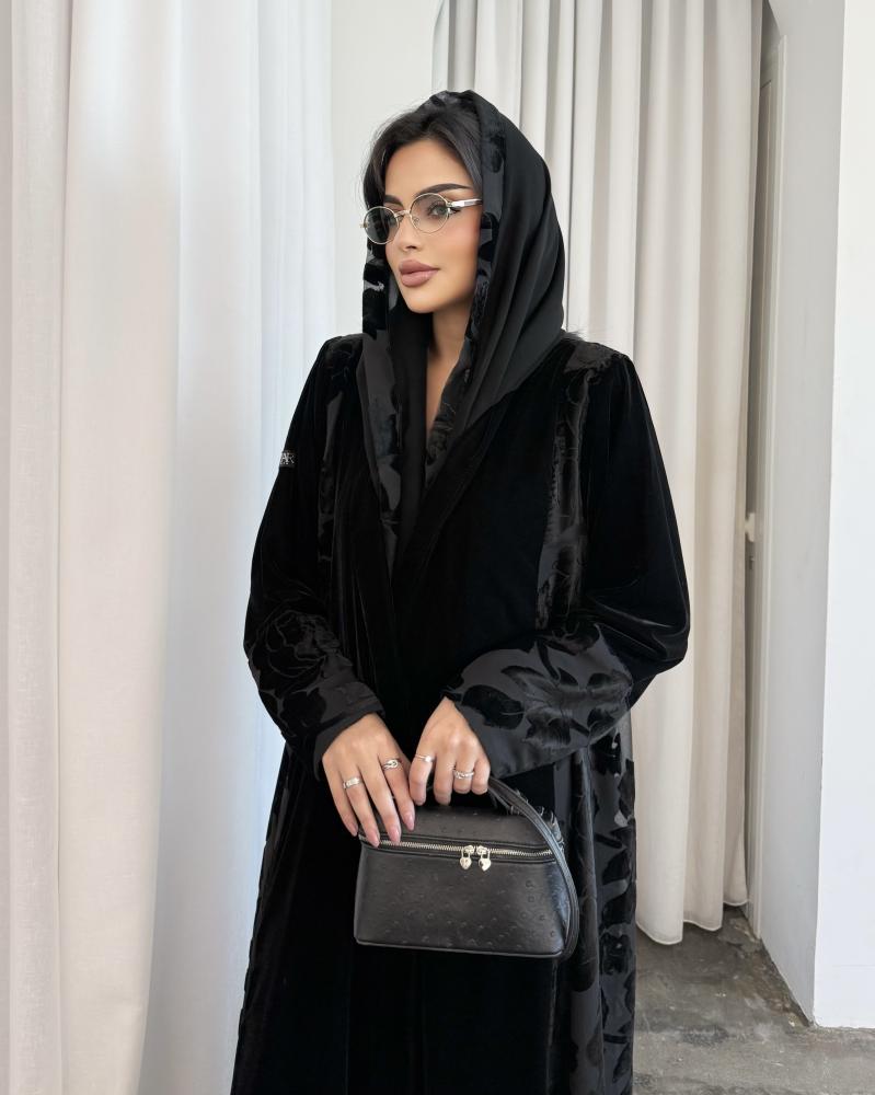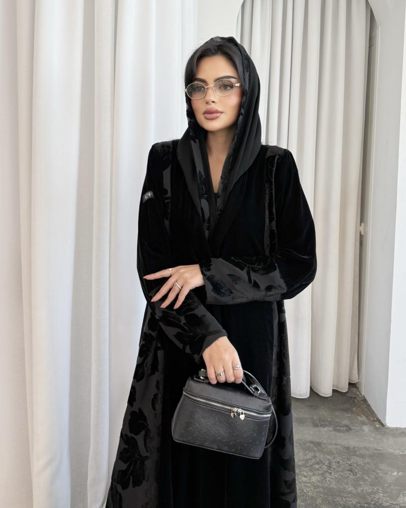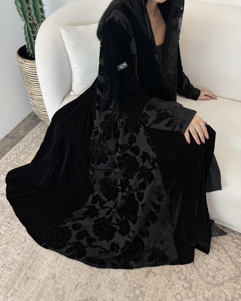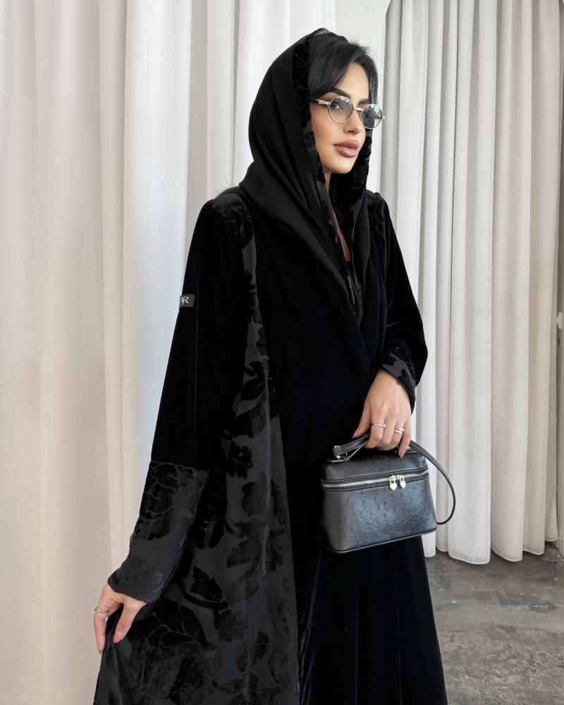 Z227 / قماش مخمل اسود مع ياقه ورسم يدوي