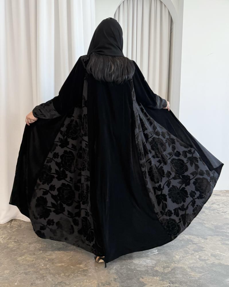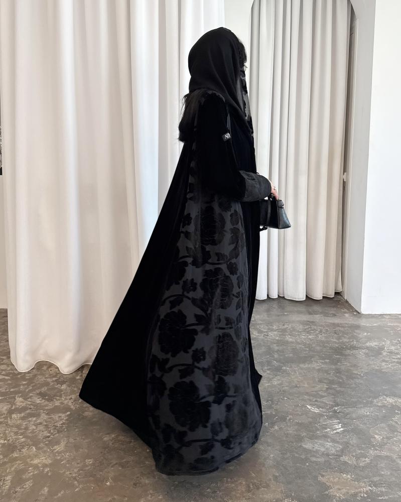 Z348 / قماش مخمل اسود ورسم يدوي امام وخلف جنب واحد