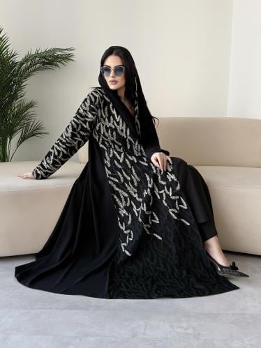 Z299 / قماش كريب وتطريز كمبيوتر قدام خيوط زري فضي واسود