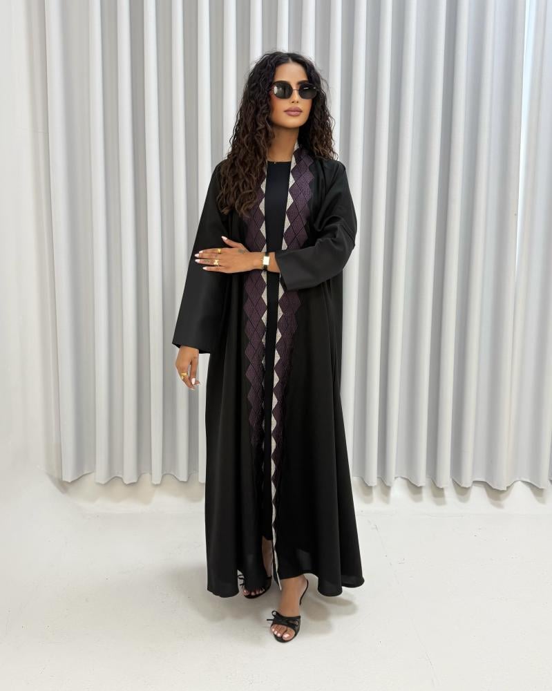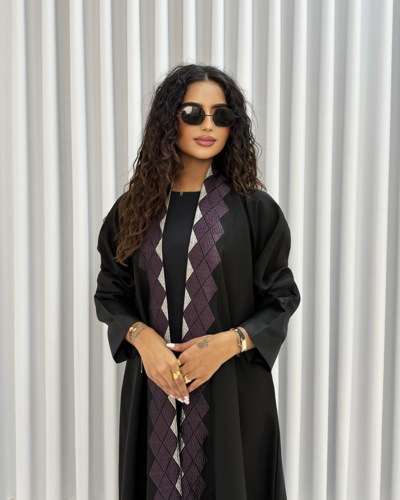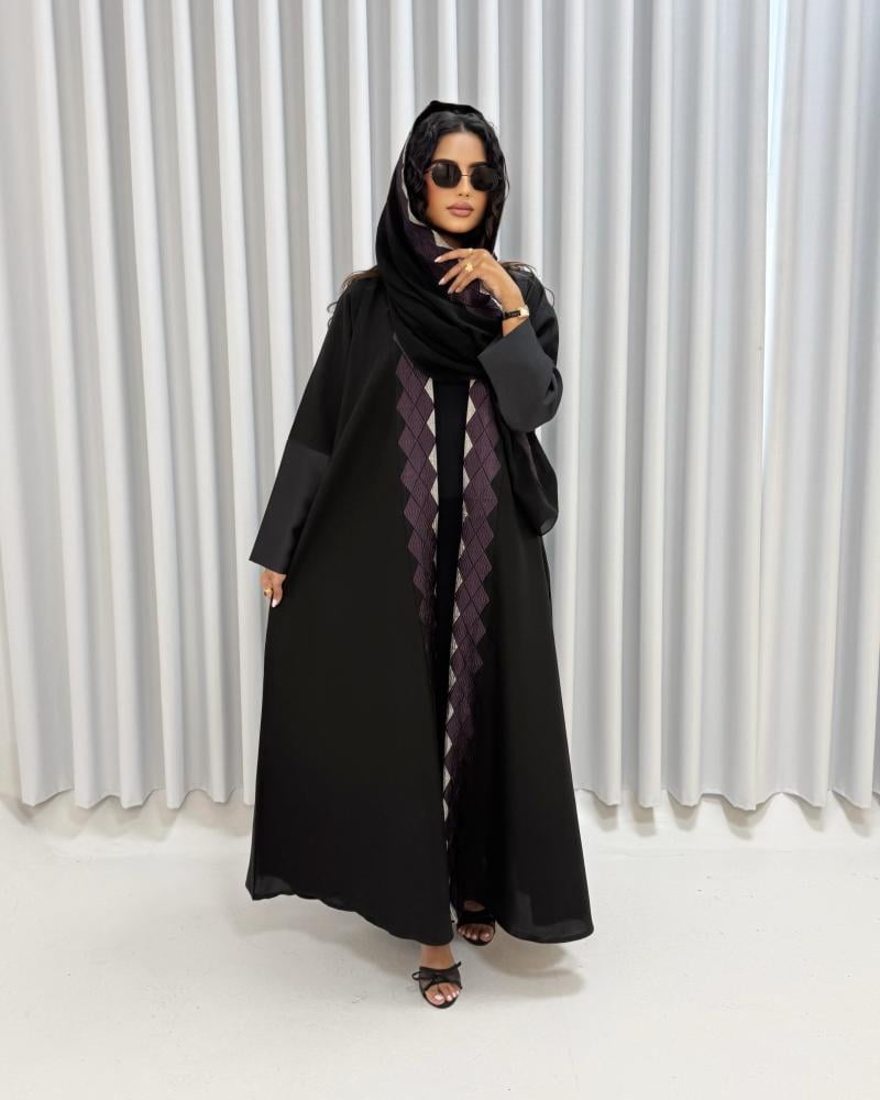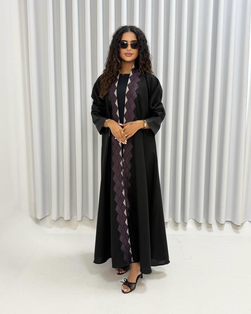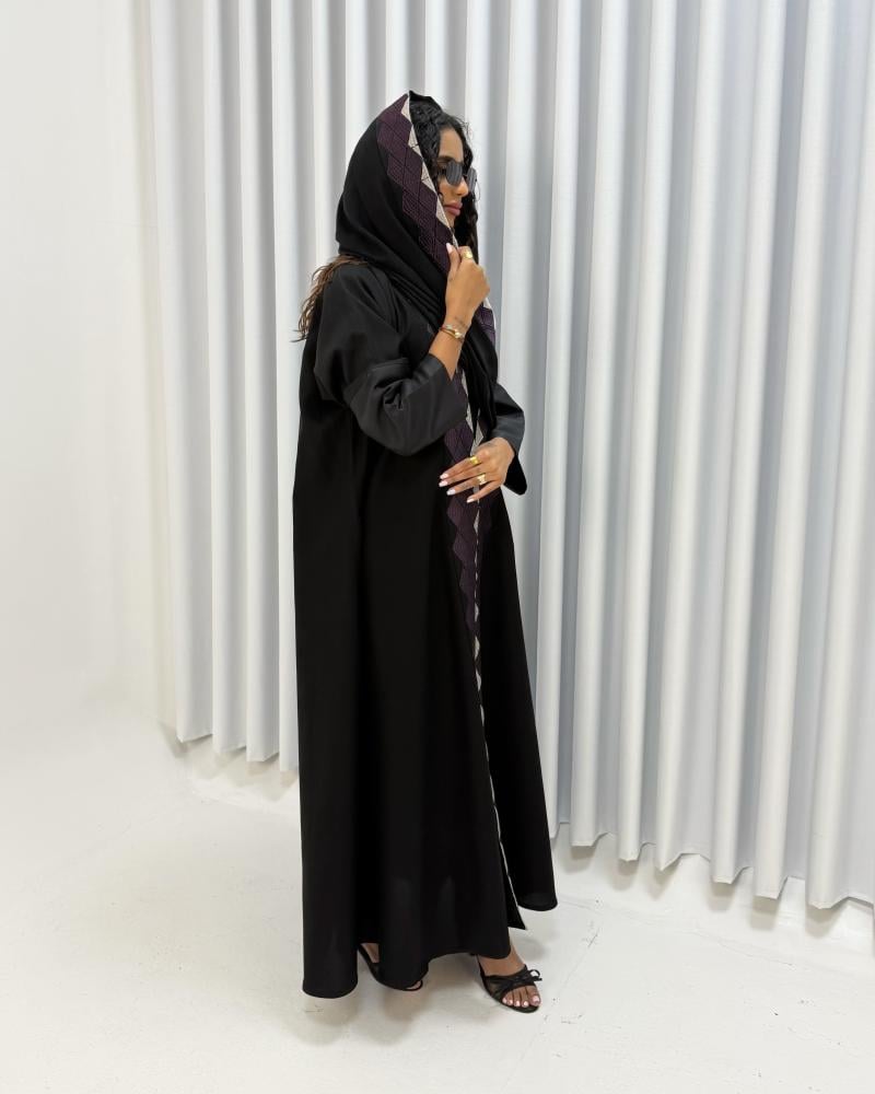 Z346 / قماش كريب كتان وتطريز موف بالامام وطرف الطرحة