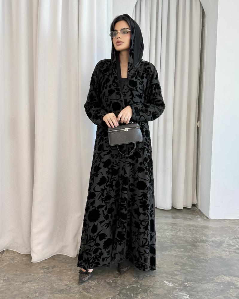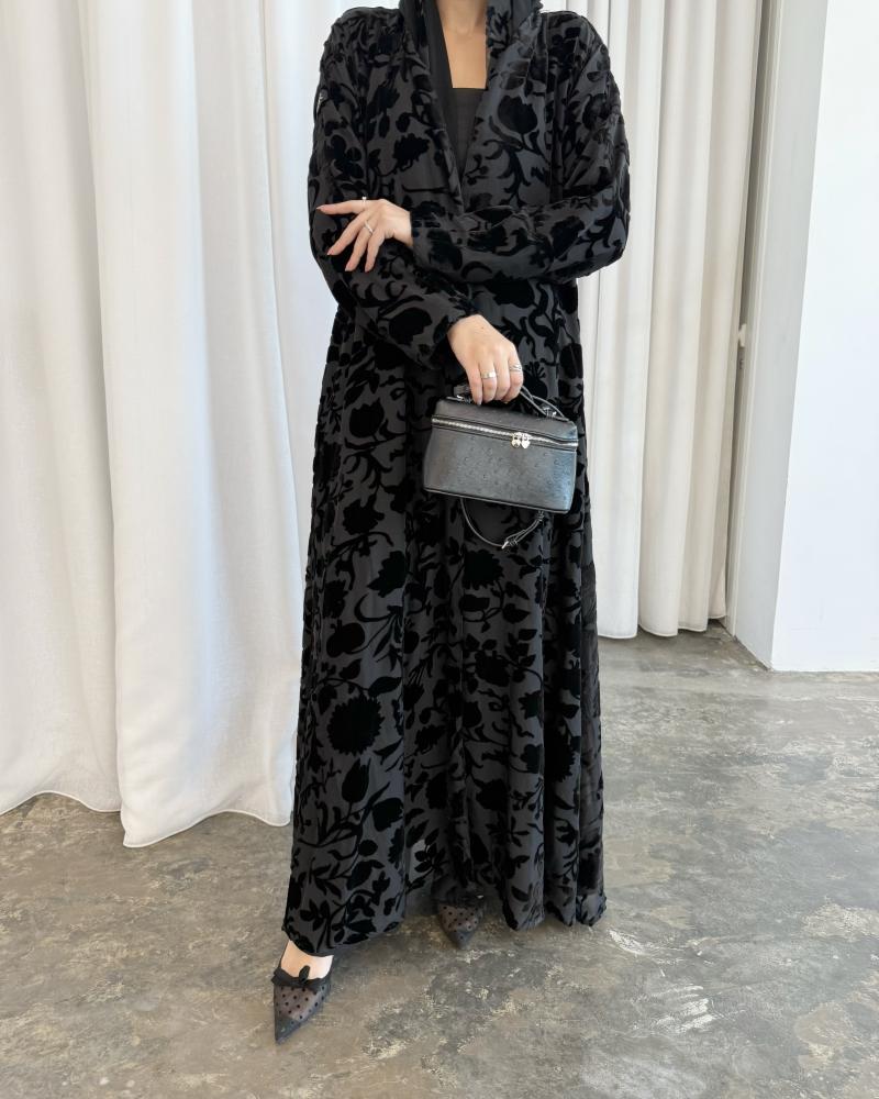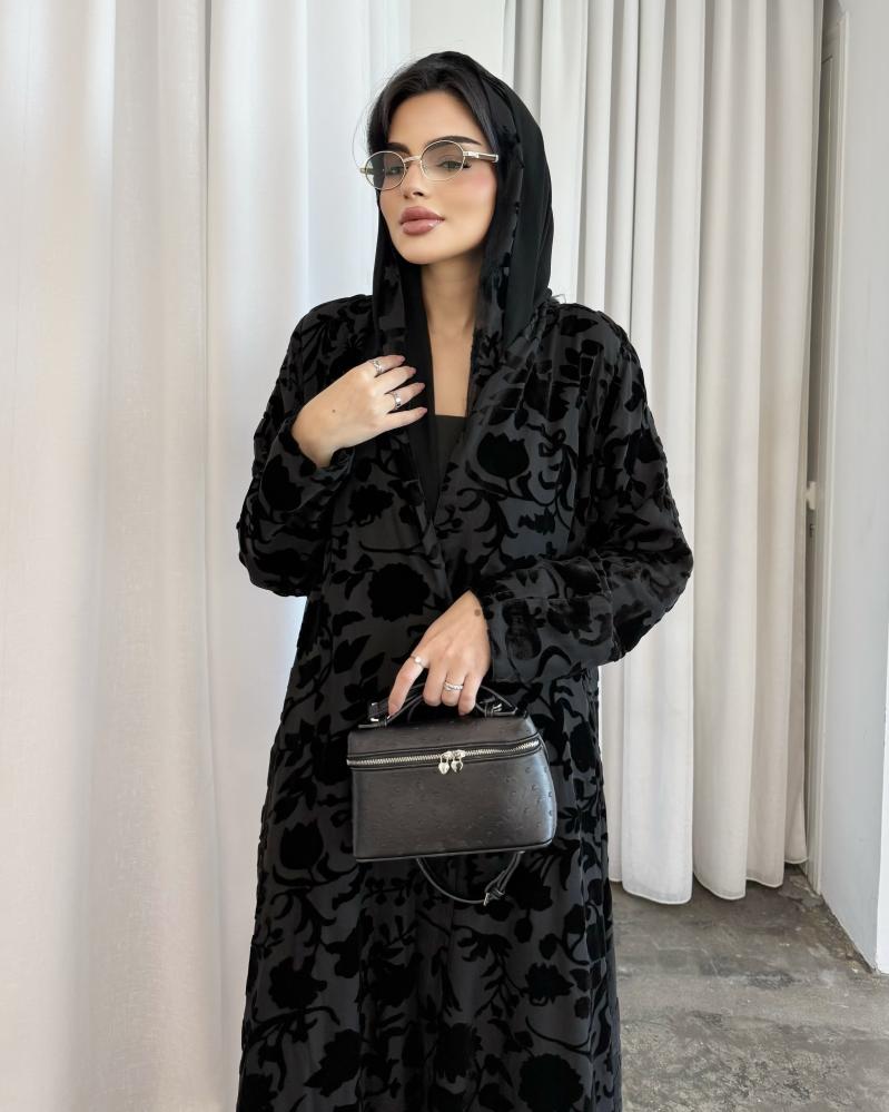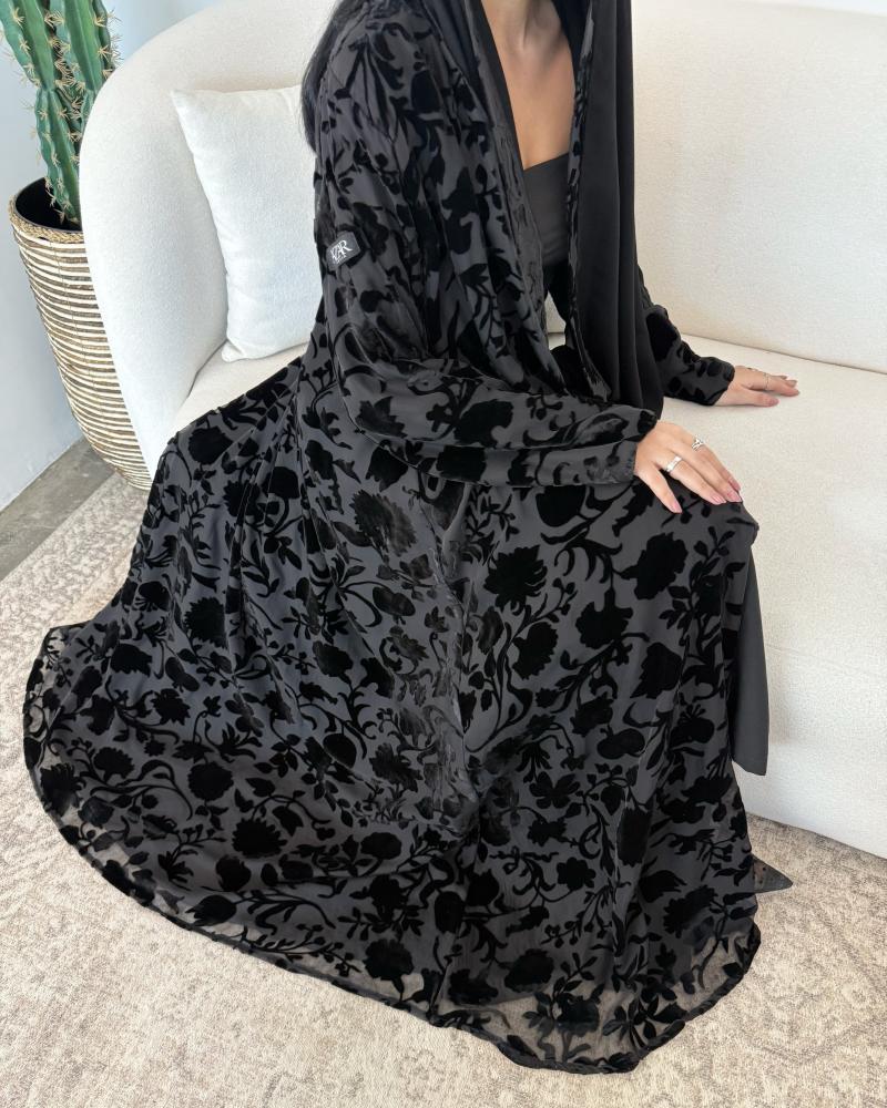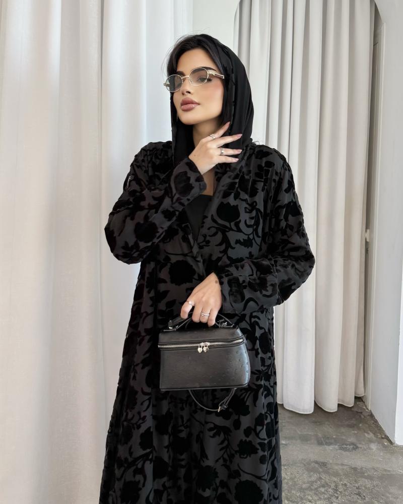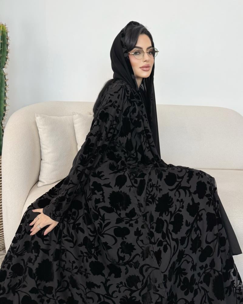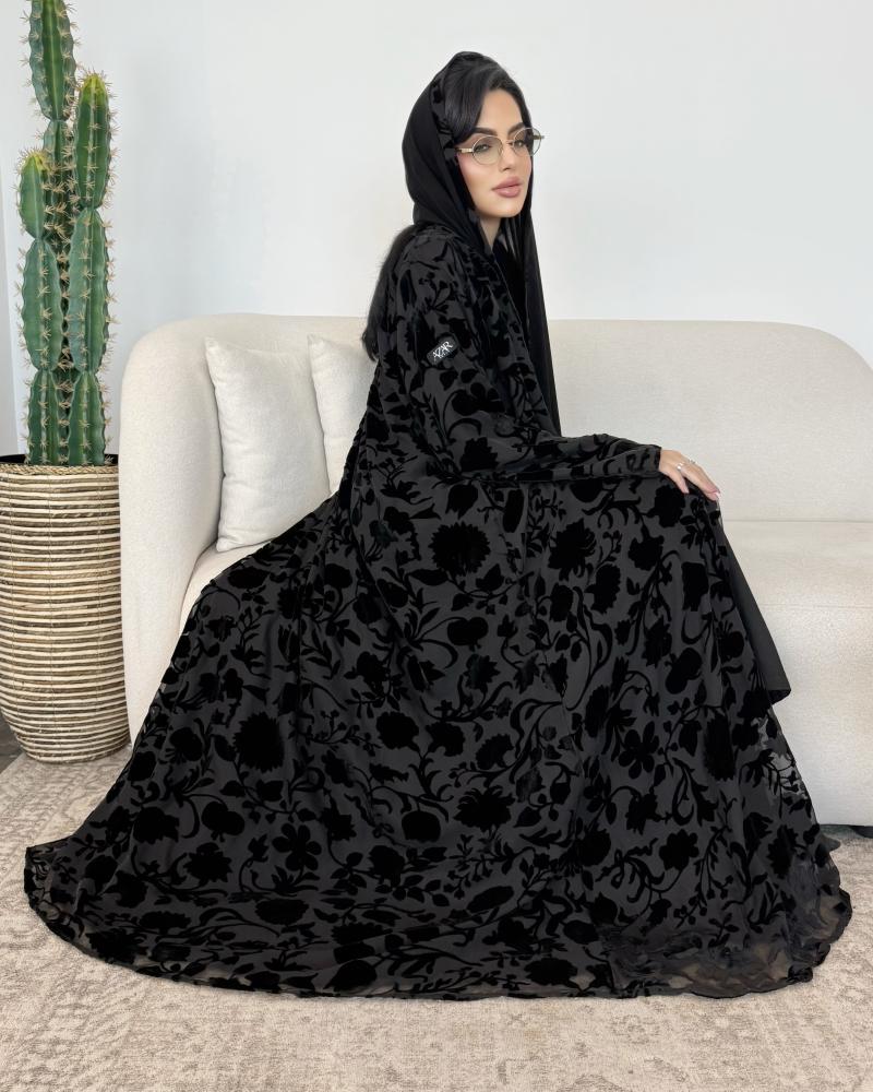 Z356 / قماش مخمل اسود والاكمام كريب مخرم مبطن مخمل