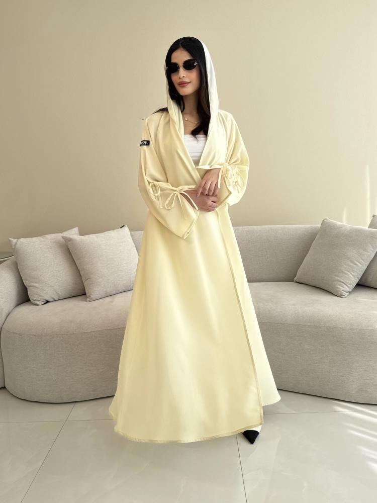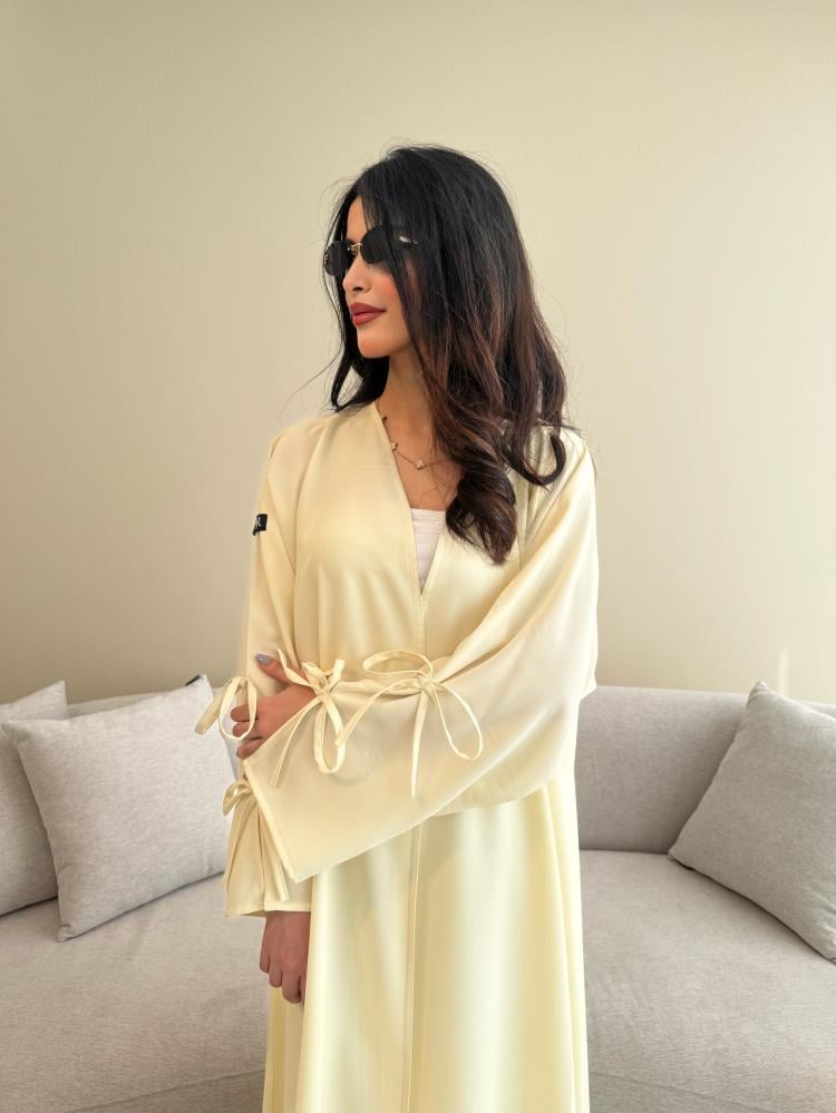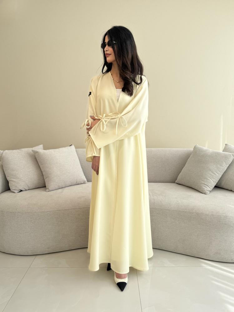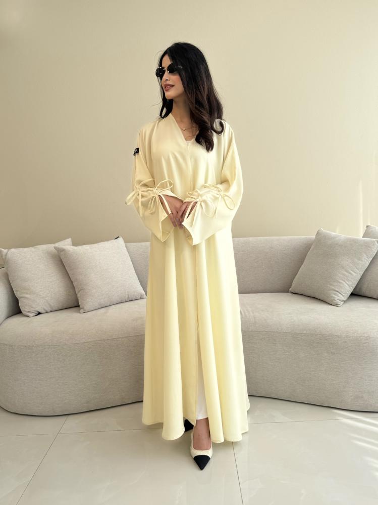 Z313 / قماش كريب صيفي لون اصفر فااتح وفيونكات بالكم