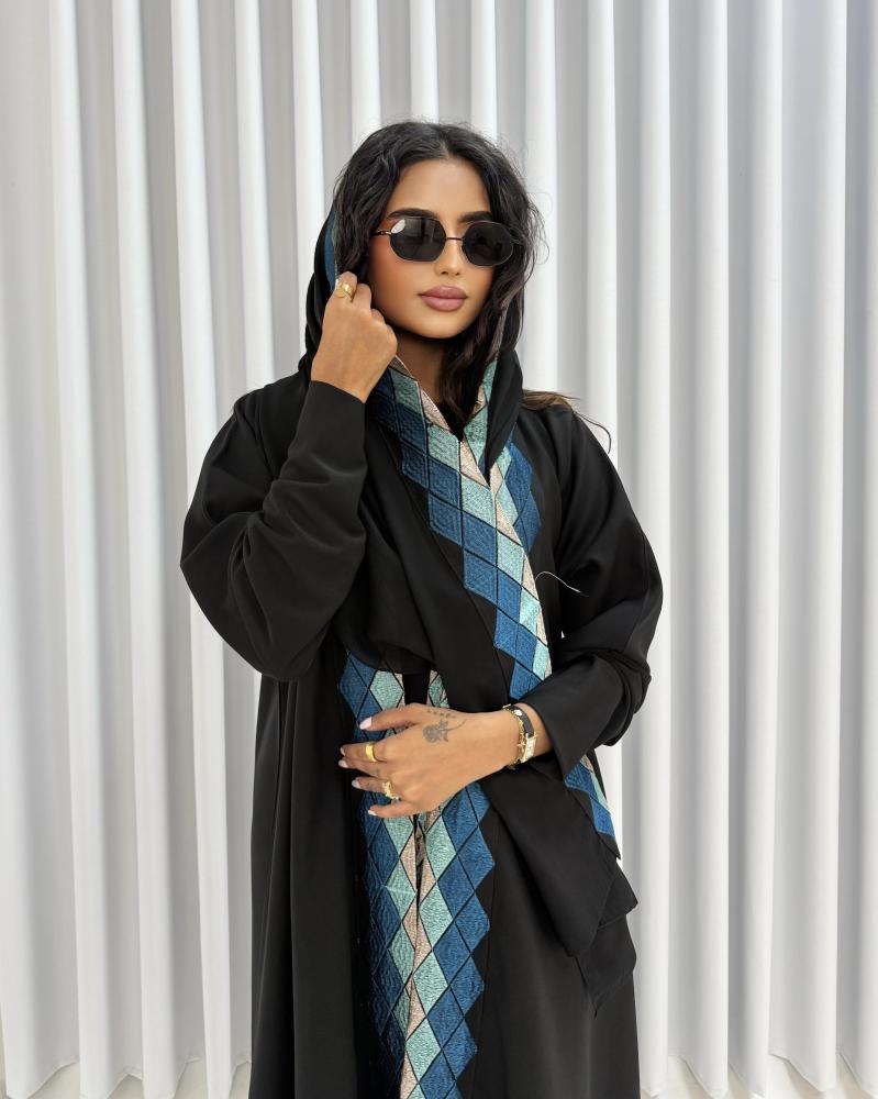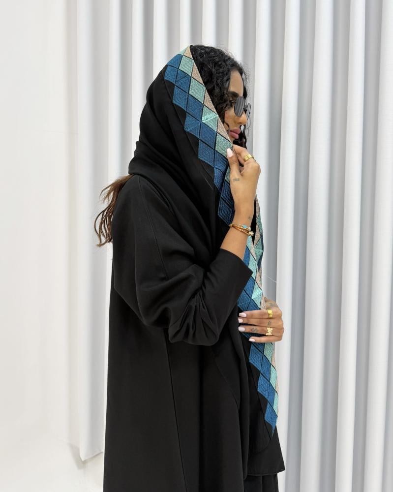 Z347 / قماش كريب كتان وتطريز ازرق بالامام وطرف الطرحة