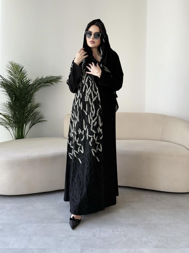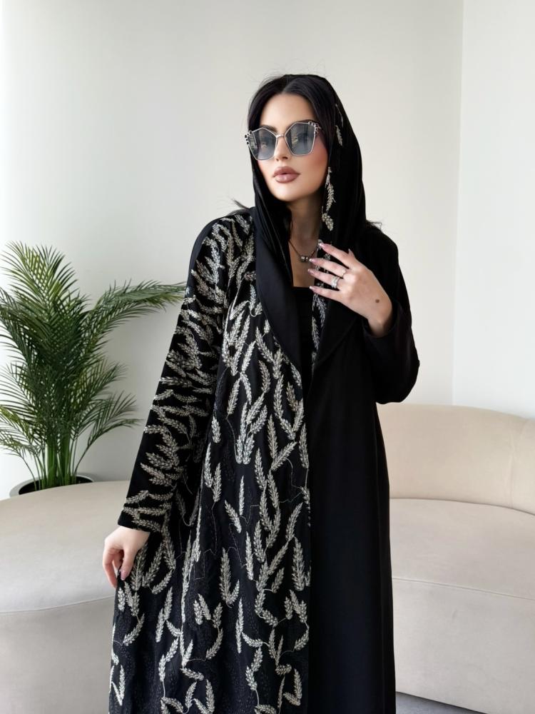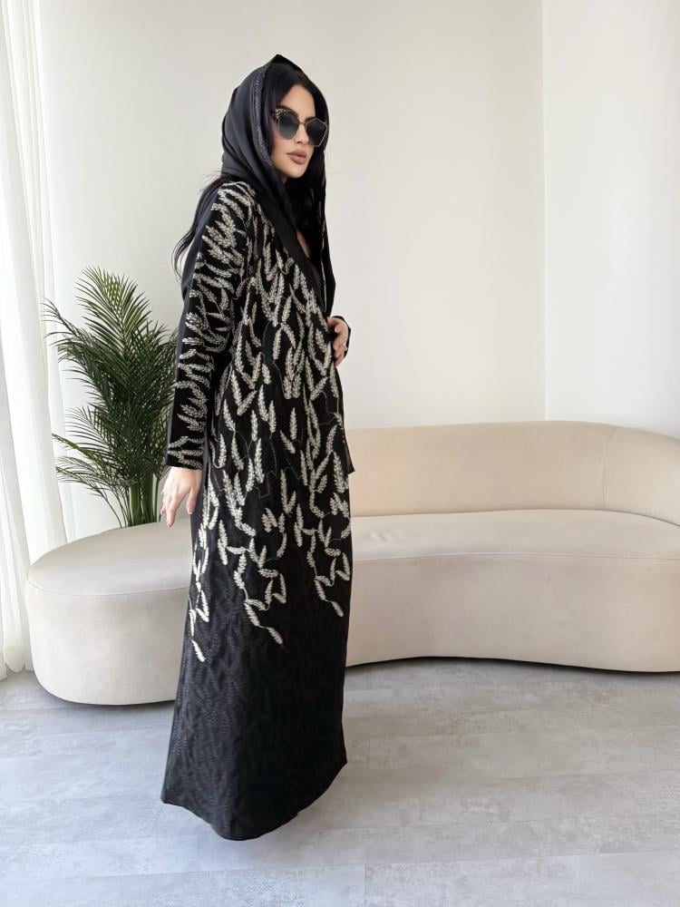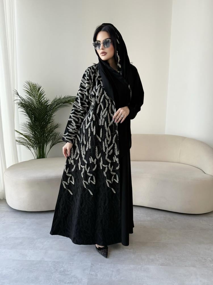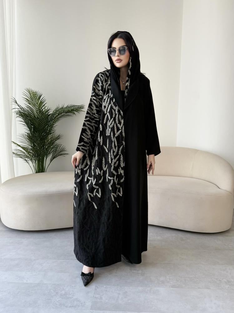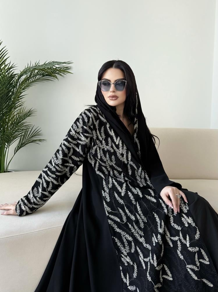 Z299 / قماش كريب وتطريز كمبيوتر قدام خيوط زري فضي واسود