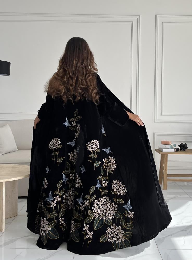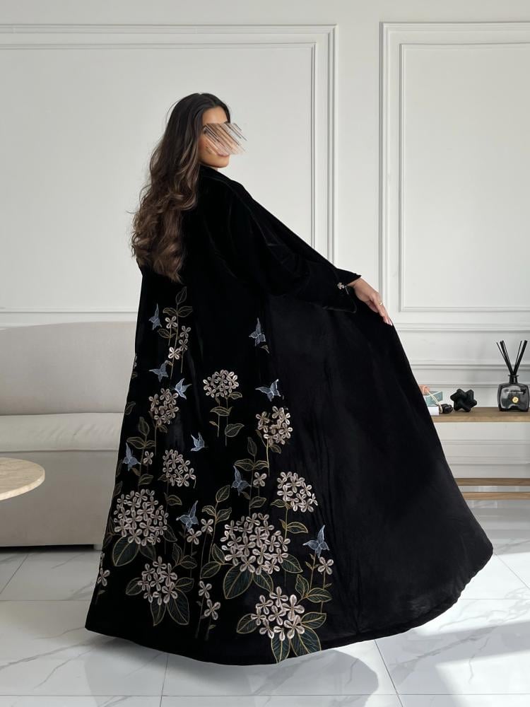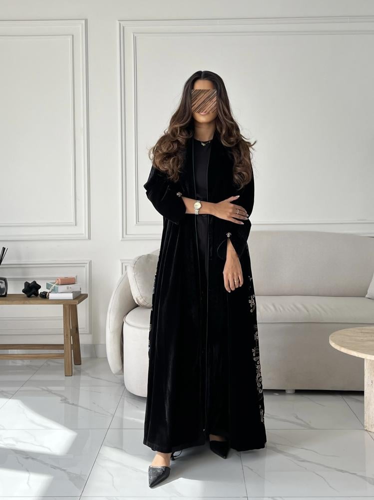 Z220 / قماش مخمل اسود وكسرات كريب مع كلفه ورد