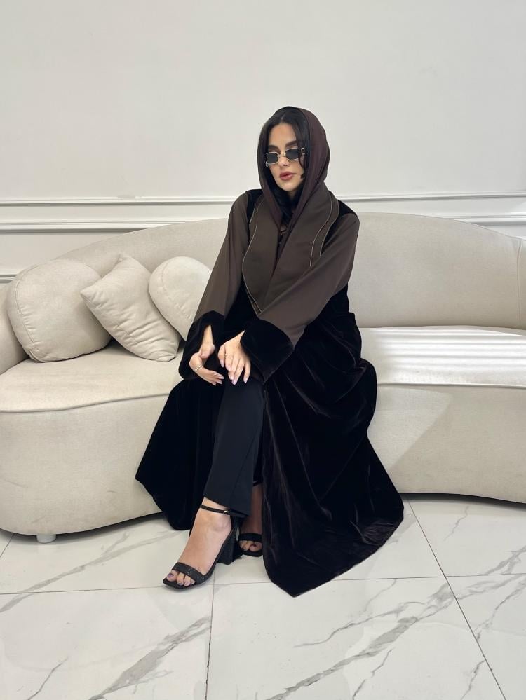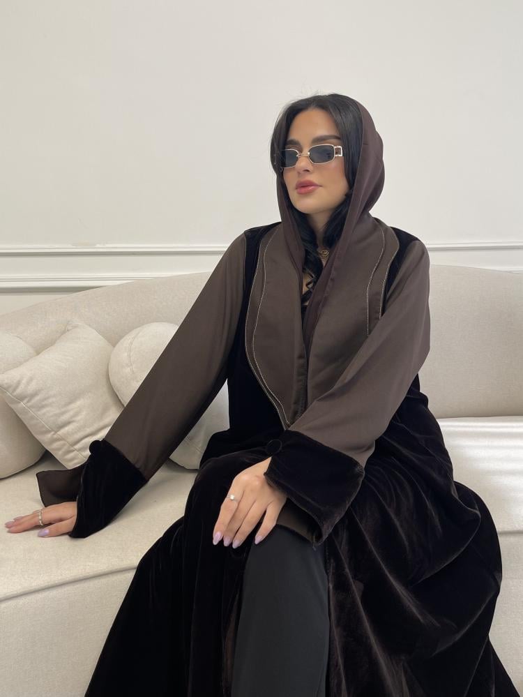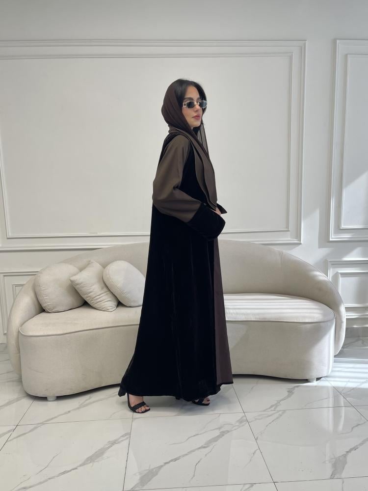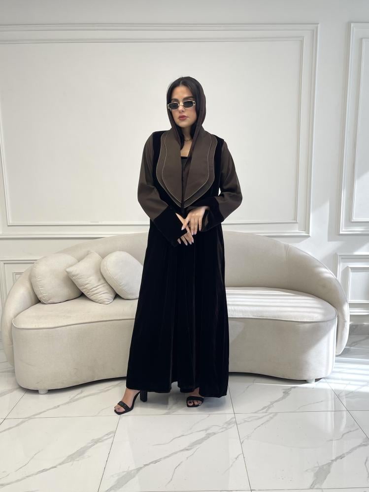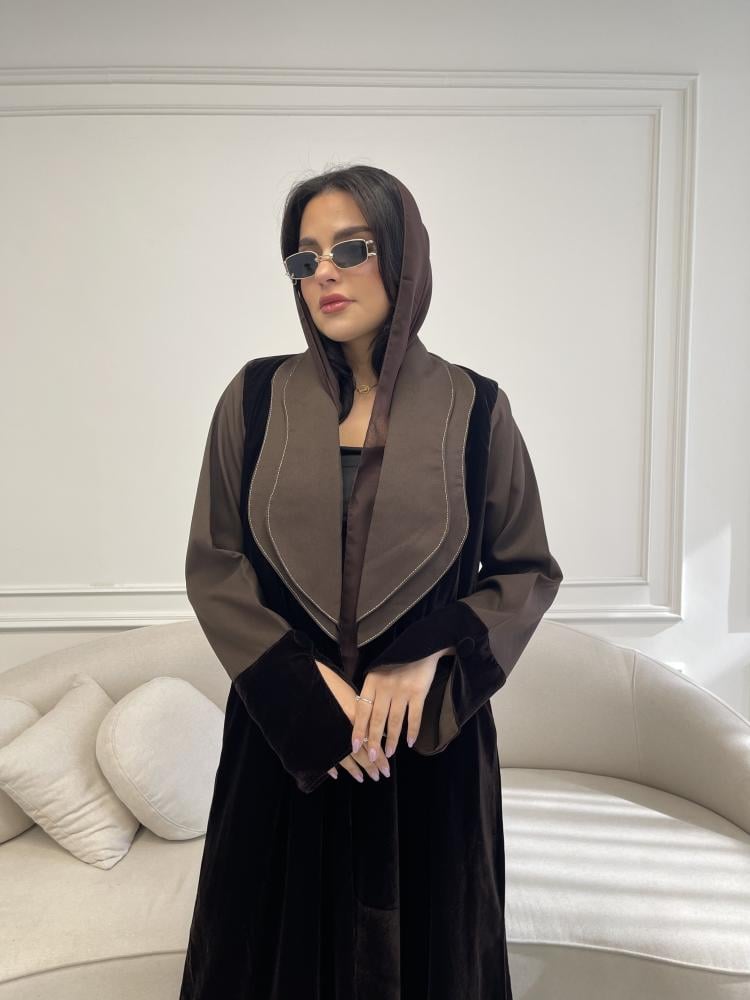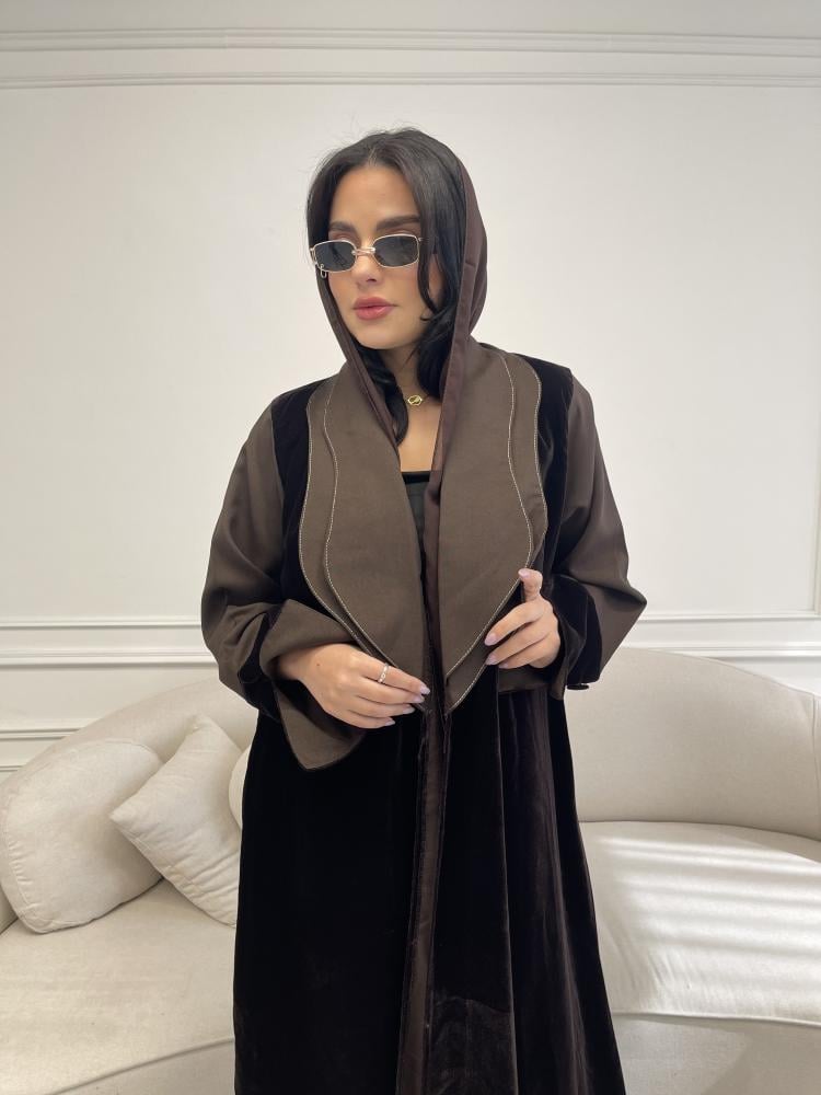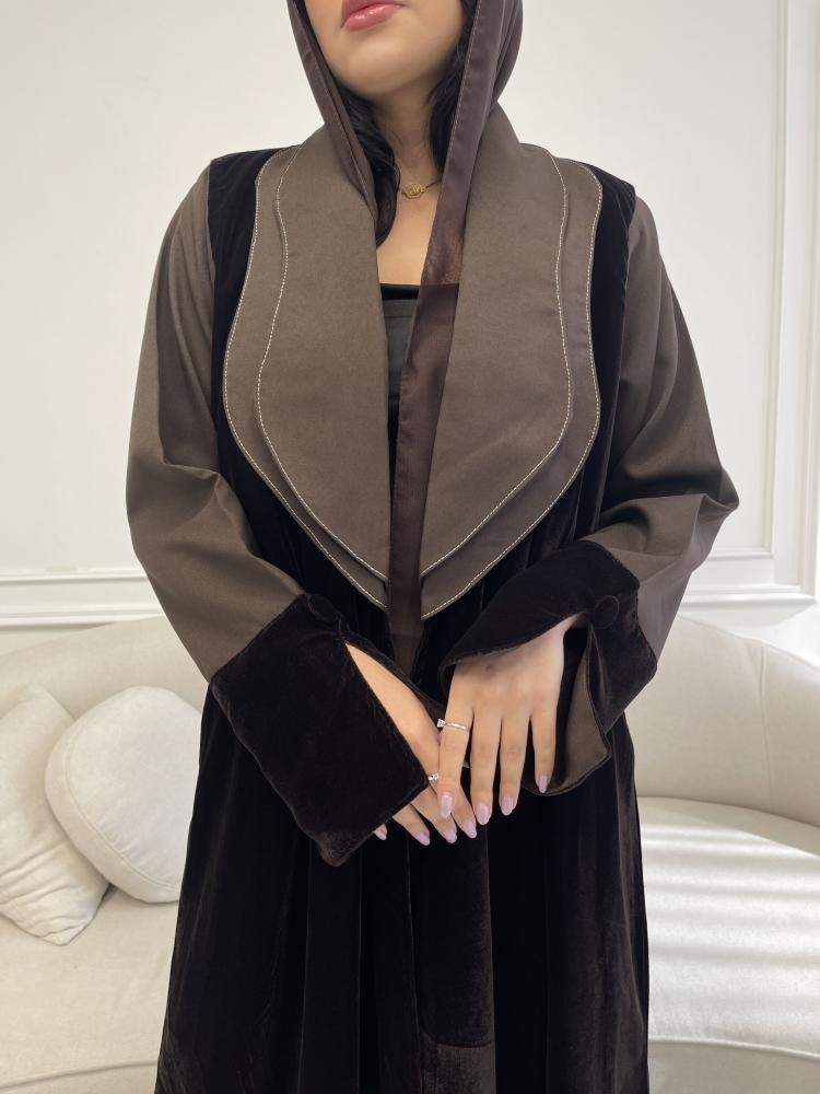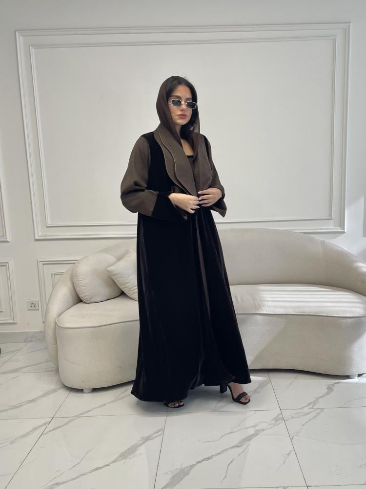 Z219 / قماش مخمل بني وياقه واكمام كريب بني