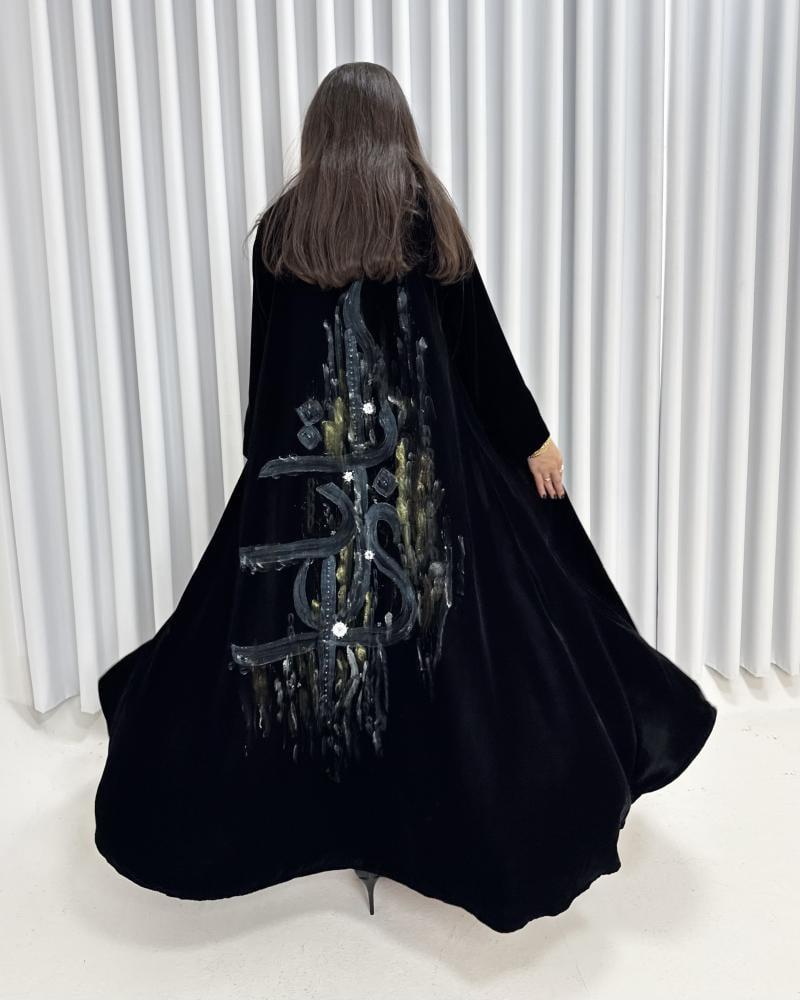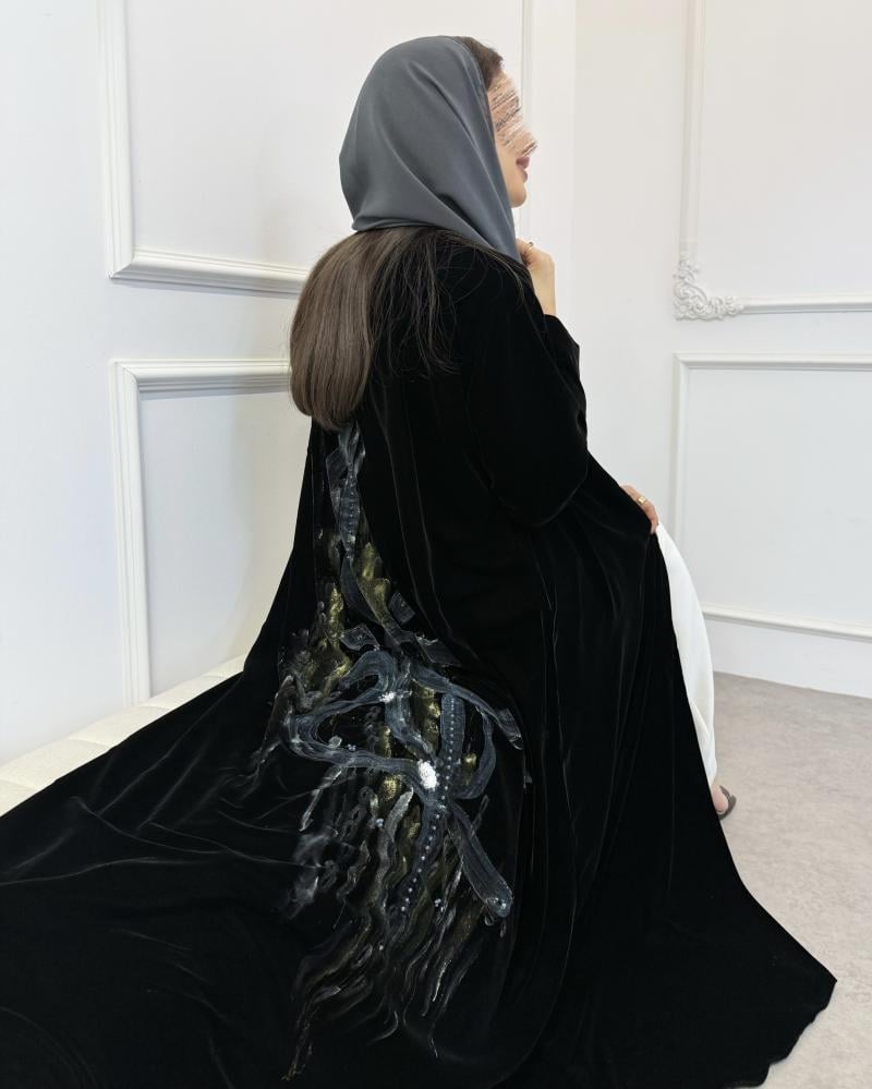 Z352 / قماش مخمل اسود ورسم يدوي على كامل العباية